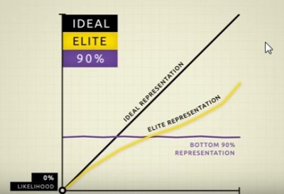 As the video below explains so well, that mean that 90% of everyone in the lower economic groups in America has “a minuscule, near zero, statistically insignificant.” influence over what laws our representatives pass in the Federal Congress.
