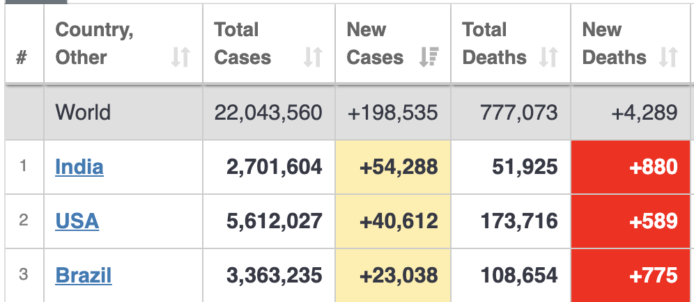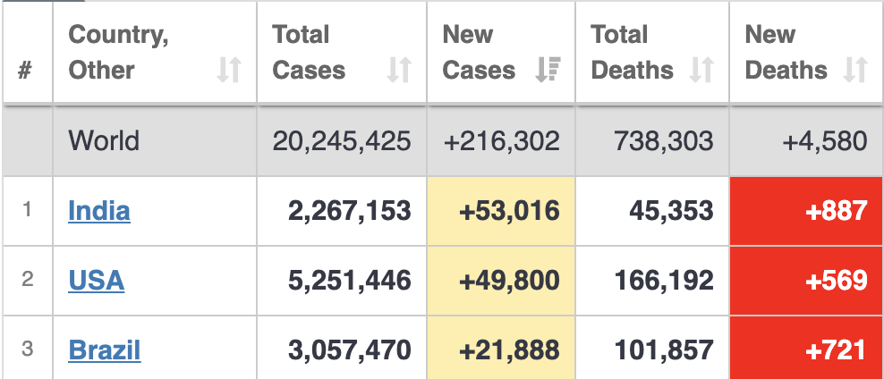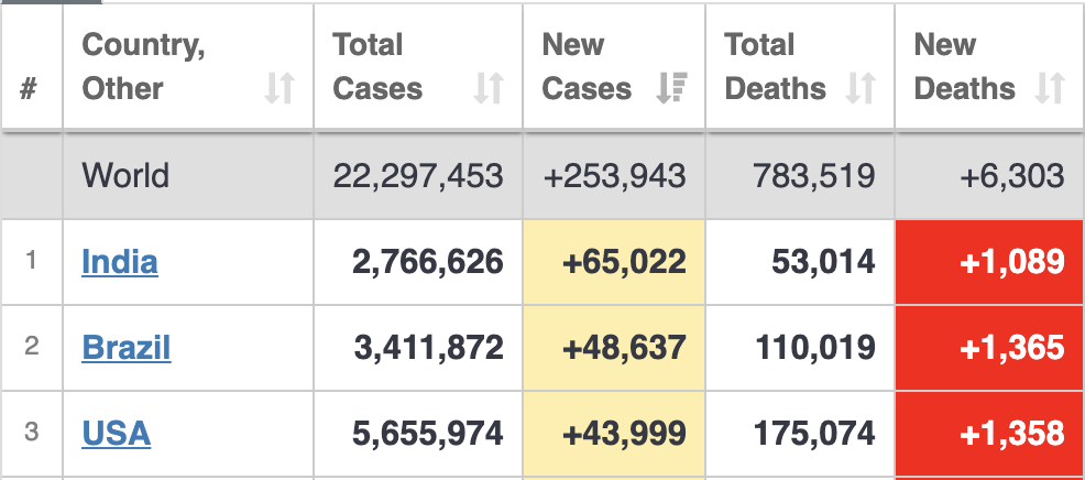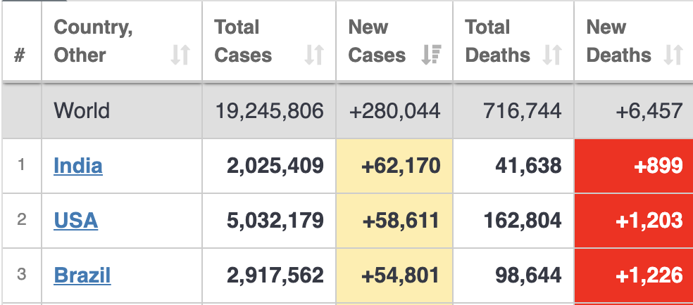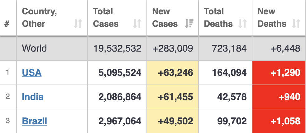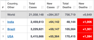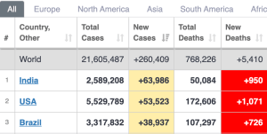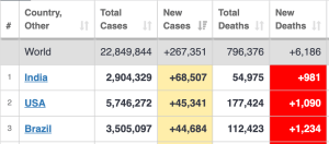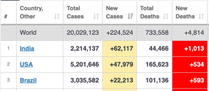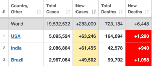 Welcome to the Daily Pandemic Diary for August. This report is divided into four parts, the U.S. daily global share of new cases in the prior 25 hour period, the U.S. daily global share of COVID-19 related deaths in the same 24 hour period, a daily commentary on the trends and related issues, and a graphic of the table from which the raw data is reported. The raw data all comes from the international Worldometer.info website. The main purpose here is to provide a daily snapshot of how the U.S. is doing relative to the world as a whole. For example, if we have 4.3% of the world’s population but 20% of the new cases, that isn’t very good. If 18 other countries are testing more of their people per million population than are we, that is an indication that we must do better, etc. The twenty-four-hour lookback is based on Grenich Mean-time. The Total Tests/U.S. Population is the ratio of all COVID-19 tests given relative to the population of only one test was given per person.