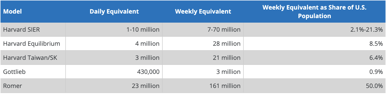 We are 148 days into our National Health Emergency yet if only one COVID-19 test was given per person in the United State to date, fewer than 1 in 5 people would have been tested. There has never been a universal agreement as to how much testing is needed in the United States in part because estimates are based on differing goals and strategies to control the virus. But there is universal agreement that our current testing numbers are inadequate. Ramping up testing to meet the current national need cannot be accomplished without federal intervention and the invoking of the National Defense Procurement Act by the President. Back in April, when there were about 25,000 new cases a day, the estimated number of COVID-19 tests needed for various strategies to bring the spread of infection under control was published in a table by the Kaiser Family Foundation. The minimum number of daily tests among the models at that time was 3 million tests per day. (see KFF table below)