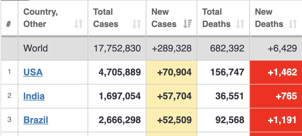 COMMENTS: We are 144 days into our national health emergency and still have over 20% of the world’s new cases despite being only 4.3% of the global population. Over 1,300 people died of the disease yesterday (R.I.P), a number that is within statistical expectations given the peak number of new cases it reflects. (It is not a statistical correction). Texas, Florida, and California still have the largest outbreaks.