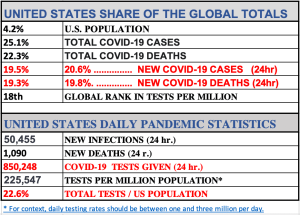 UNITED STATES SHARE OF THE GLOBAL TOTALS04.3% …………… U.S. POPULATION26.2% …………… TOTAL COVID-19 CASES22.7% ………….. TOTAL COVID-19 DEATHS 20.9% …………… NEW COVID-19 CASES (24hr)18.6%. ………….. NEW COVID-19 DEATHS (24hr)18th ………….. GLOBAL RANK IN TESTS PER MILLION