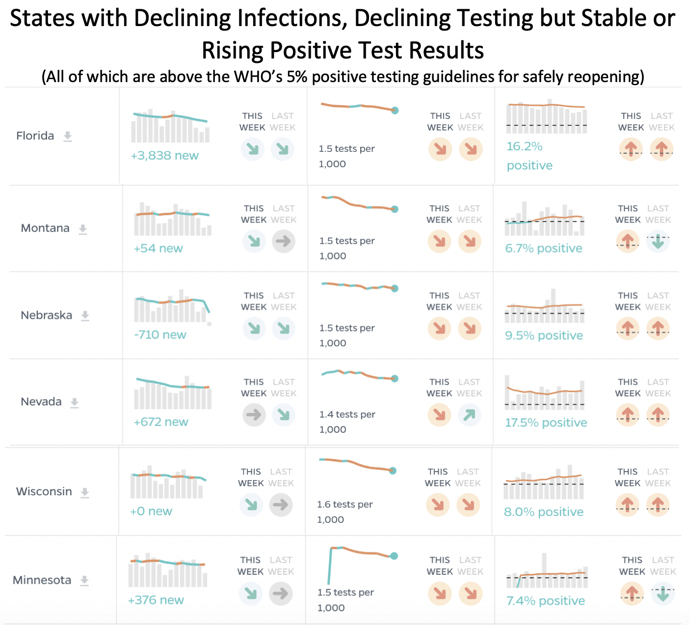 Comments: One out of four COVID-19 infections around the world have happened here in the United States and new infections rates are still four times higher than expected given our population. Testing is still lagging behind given our case numbers, especially in the states of Florida, Texas where more testing is badly needed. As mentioned a few days ago, testing rates have declined by about 13% in the past two weeks prompting some reporting that suggests fewer tests is a way to suppress the reporting of daily new cases for political reasons in some states. If this is happening we should see a decline in both testing and cases with positive test rate either stable or trending upward, not downward (unless people with symptoms are not being tested while those without symptoms are being tested in greater numbers.)