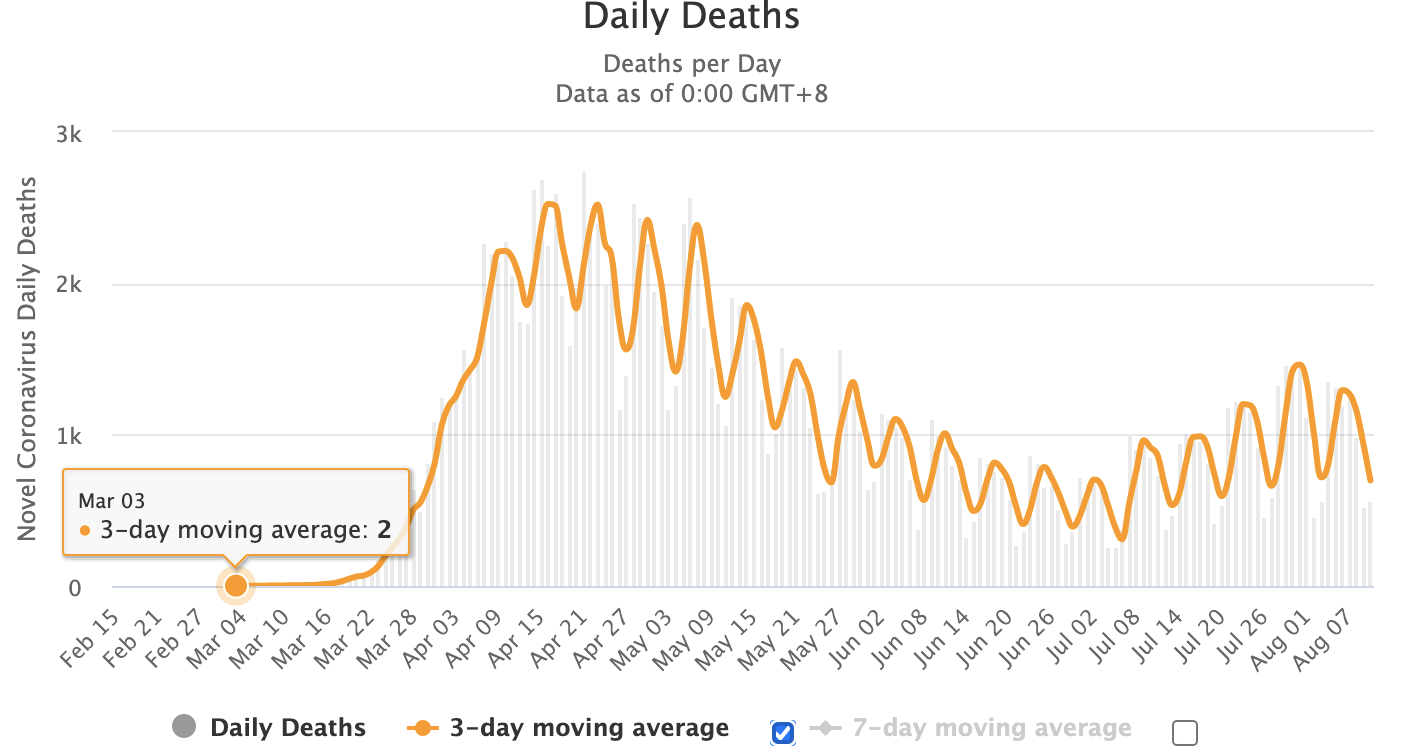 Interestingly, a look back at the peaks and valleys of daily reporting over time, both the daily new cases and COVID deaths, reveals that there is a weekly reporting cycle where the peaks mostly happen mid-week and the valleys occur around the weekends. The line graph of reported deaths for a three-day daily average (below) shows the regularity of this weekly reporting pattern. When looking at these daily statistical totals, the day of the week should be factored in. Note that there are 18 peaks in the graph below which correspond to the 18 weeks between April 3rd, and August 7th.