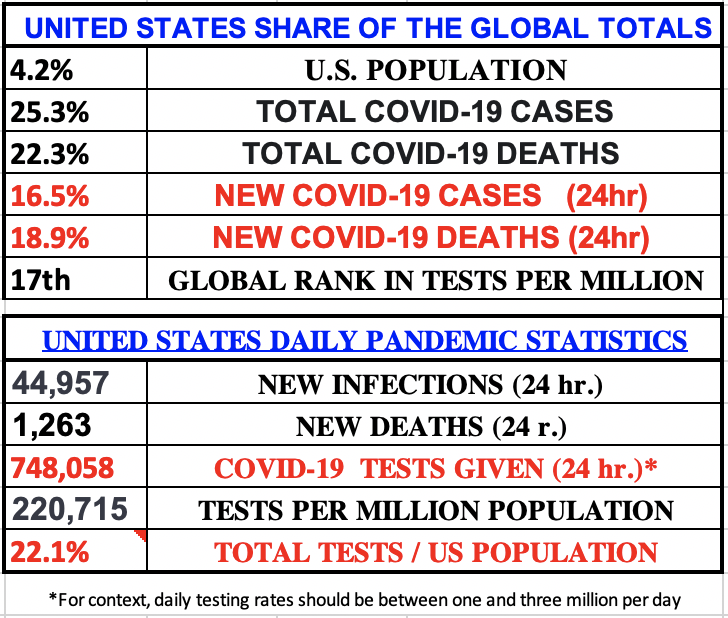 UNITED STATES SHARE OF THE GLOBAL TOTALS04.2% …………… U.S. POPULATION25.5% …………… TOTAL COVID-19 CASES22.4% ………….. TOTAL COVID-19 DEATHS 17.3% …………… NEW COVID-19 CASES (24hr) 11.5%. ………….. NEW COVID-19 DEATHS (24hr) 18th ………….. GLOBAL RANK IN TESTS PER MILLION