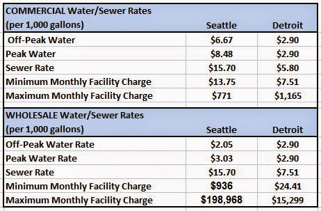 The table below directly compares the published water and sewer rates for Detroit and Seattle (converted to dollars/1,000 gallons). Seattle was selected for comparison because it was one of the cities mention in the USA Today article as having the highest rates. The data is from both city websites.