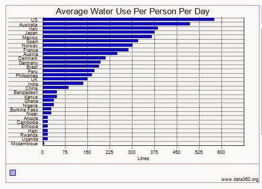 The benchmark for monthly water use in the OECD survey was 15 cubic meters per month, or 3,963 gallons per month, compared with 7,481 gallons per month in the United States. As the graph below shows, U.S. households use more water than do households in most other countries. In the examples above, the difference represents an 88% higher rate of water use in the U.S.