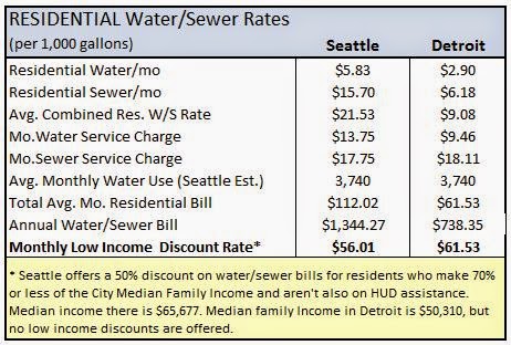 Detroit, a city with a median family income 25% lower than Seattle, has flat rates. It offers no low income discounts. As a result, the average low income water/sewer bill in Detroit is higher than in Seattle.
